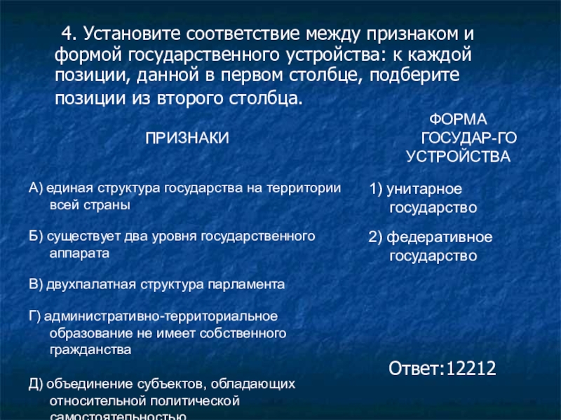 4. В государстве К. президент выполняет представительские функции, правительство формируется партиями, победившими на парламентских выборах, и несет ответственность перед парламентом. Какова форма правления в государства К.?
