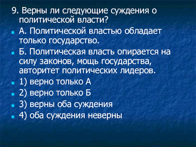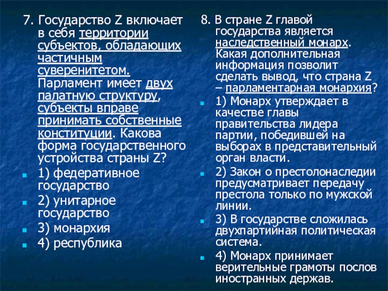 8. В стране Z главой государства является наследственный монарх. Какая дополнительная информация позволит сделать вывод, что страна Z – парламентарная монархия?