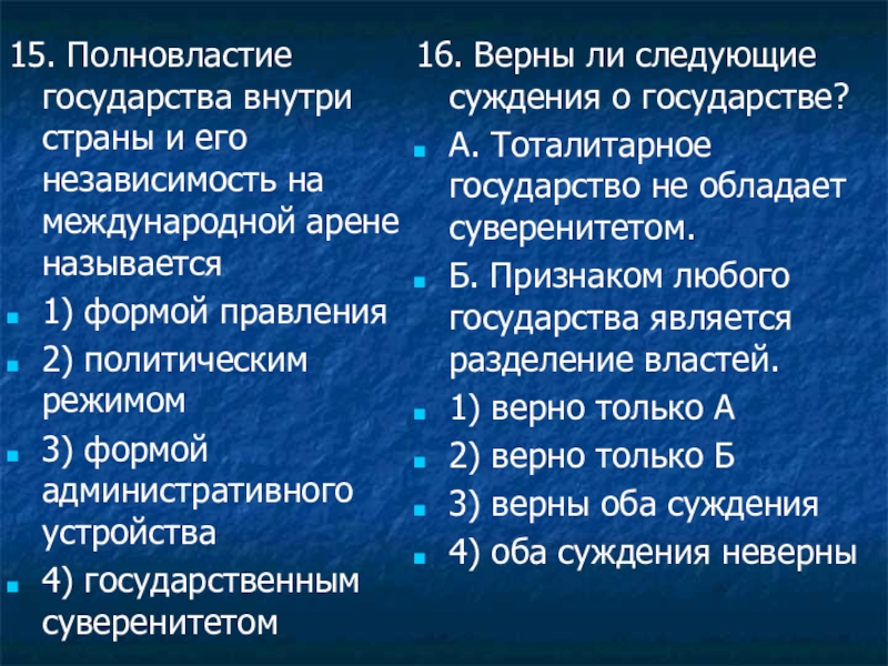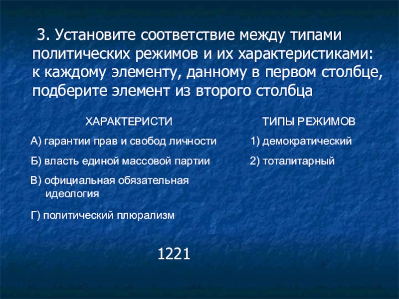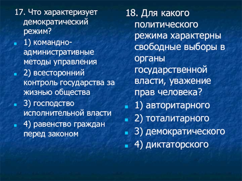 18. Для какого политического режима характерны свободные выборы в органы государственной власти, уважение прав человека?