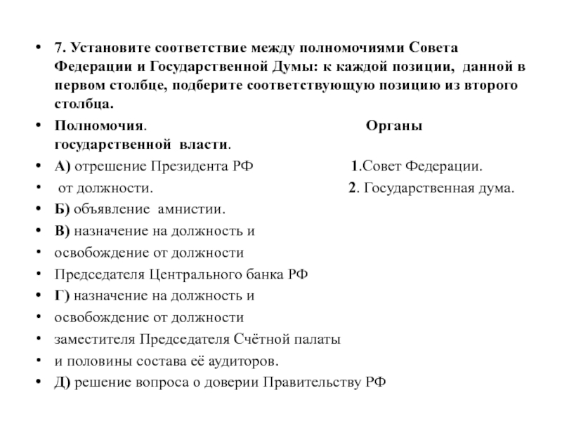 Слайд 87. Установите соответствие между полномочиями Совета Федерации и Государственной Думы: к