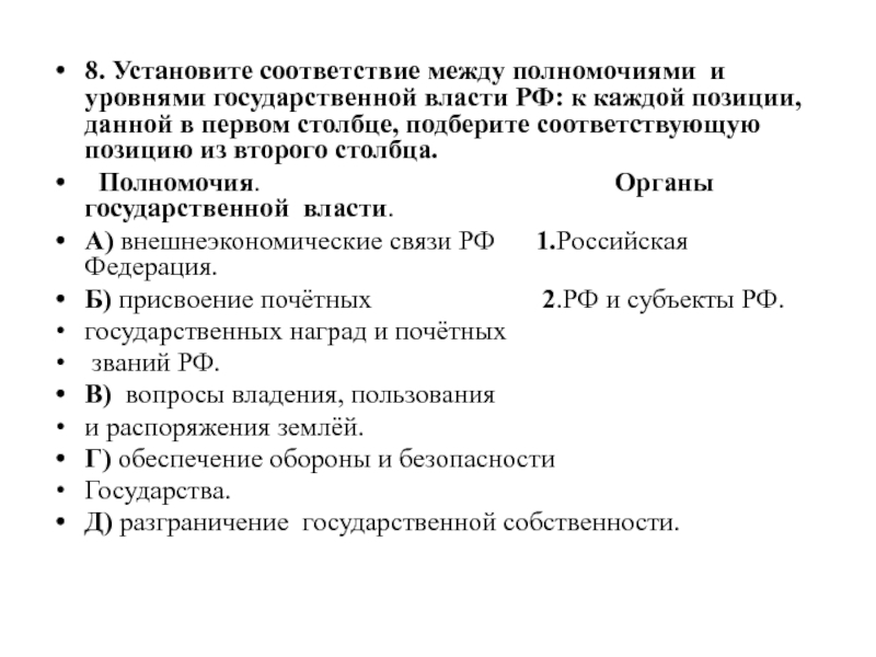 Слайд 98. Установите соответствие между полномочиями и уровнями государственной власти РФ: к