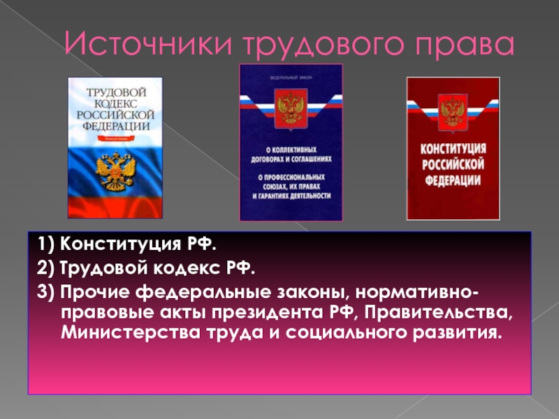 законы, нормативно-правовые акты президента РФ, Правительства, Министерства труда и социального развития.