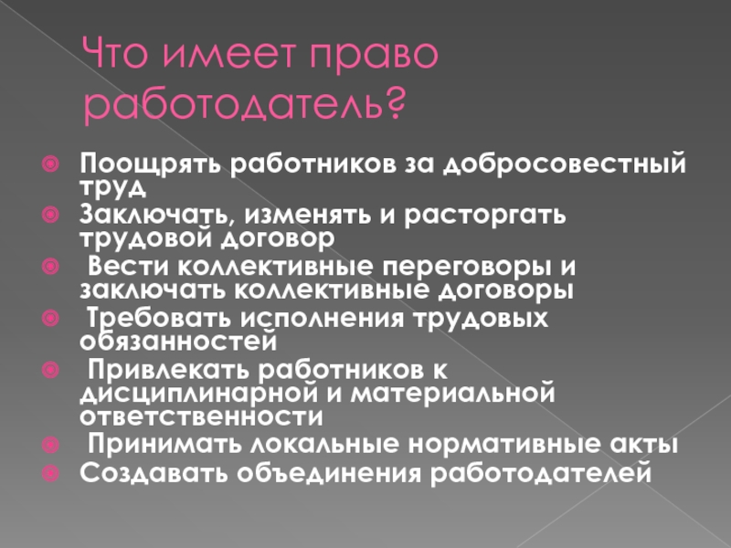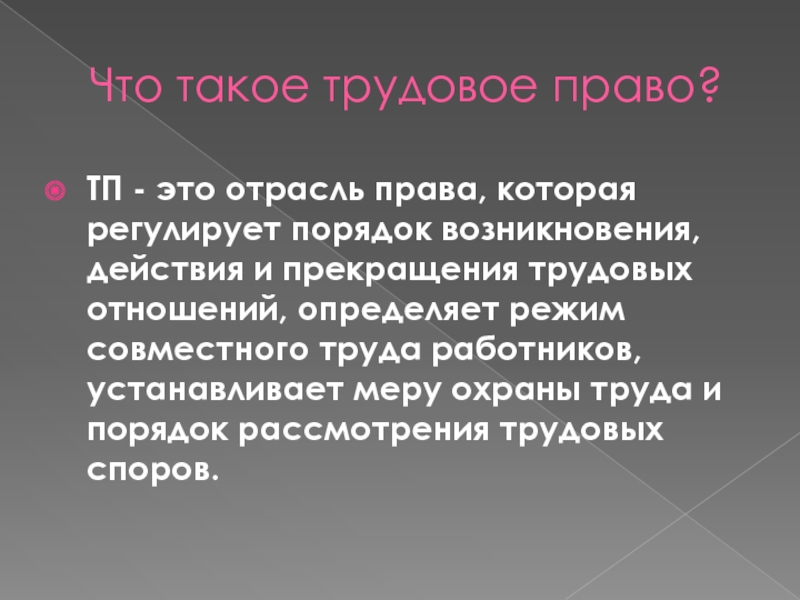 возникновения, действия и прекращения трудовых отношений, определяет режим совместного труда работников, устанавливает меру охраны труда и порядок рассмотрения трудовых споров.