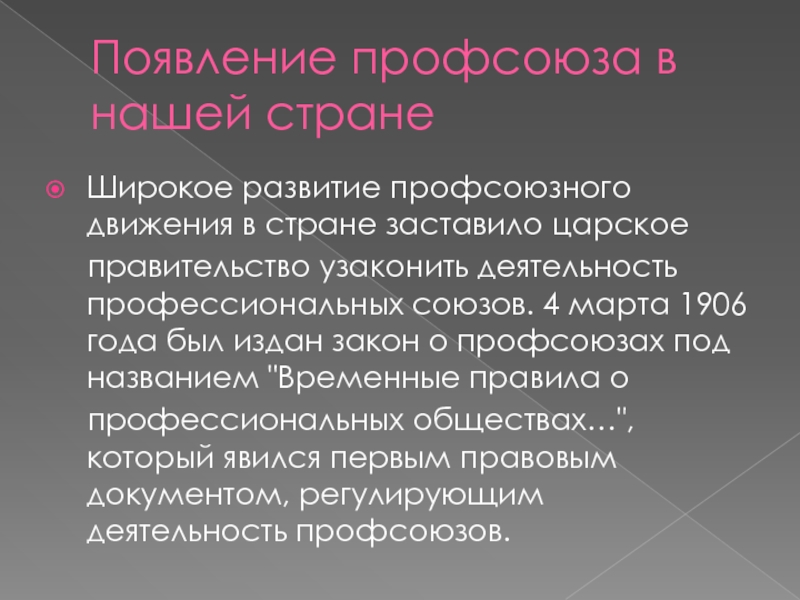 правительство узаконить деятельность профессиональных союзов. 4 марта 1906 года был издан закон о профсоюзах под названием "Временные правила о