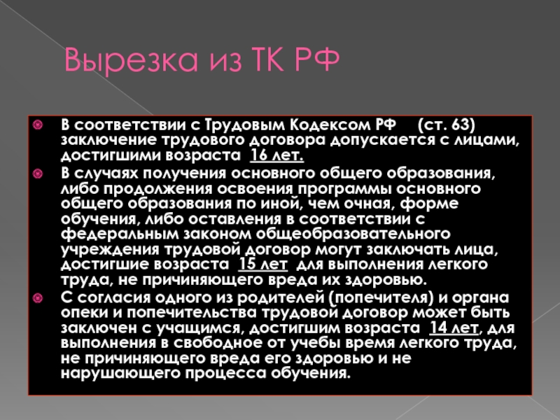 В случаях получения основного общего образования, либо продолжения освоения программы основного общего образования по иной, чем очная, форме обучения, либо оставления в соответствии с федеральным законом общеобразовательного учреждения трудовой договор могут заключать лица, достигшие возраста 15 лет для выполнения легкого труда, не причиняющего вреда их здоровью.