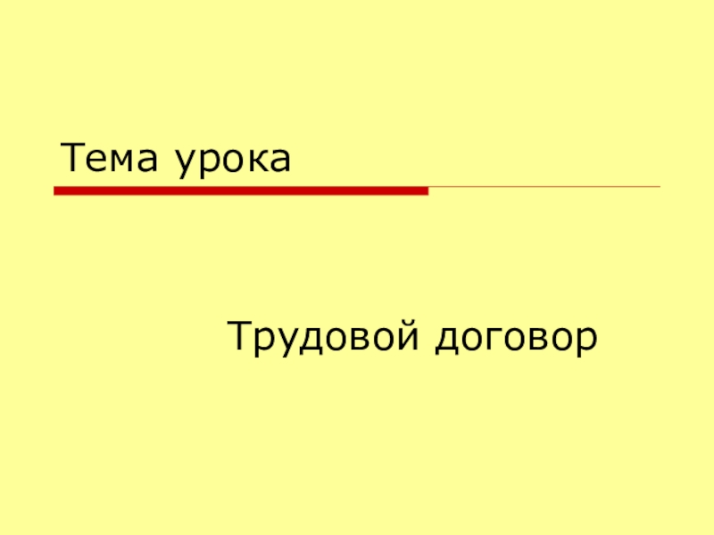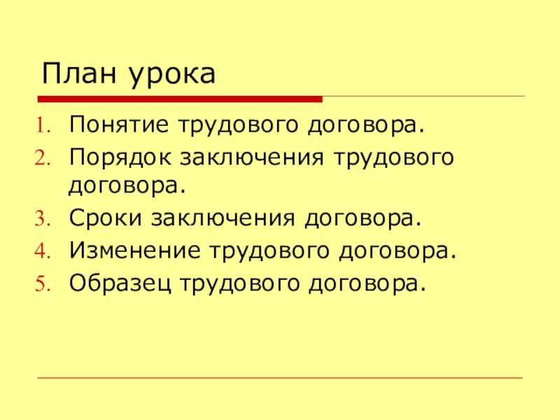План урокаПонятие трудового договора.Порядок заключения трудового договора.Сроки заключения договора.Изменение трудового договора.Образец трудового договора.