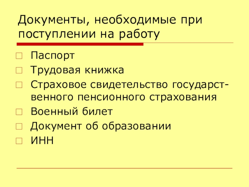 Документы, необходимые при поступлении на работуПаспортТрудовая книжкаСтраховое свидетельство государст-венного пенсионного страхованияВоенный билетДокумент об образованииИНН