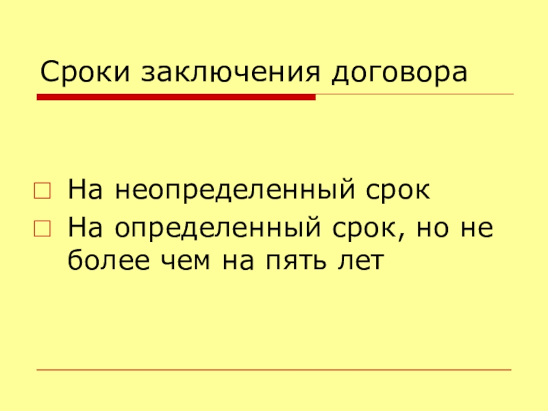 Сроки заключения договораНа неопределенный срокНа определенный срок, но не более чем на пять лет