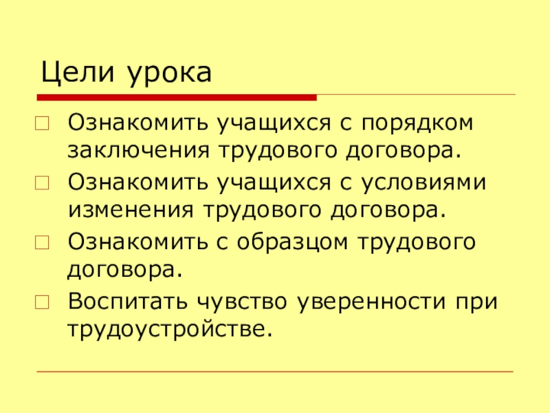 Цели урокаОзнакомить учащихся с порядком заключения трудового договора.Ознакомить учащихся с условиями изменения трудового договора.Ознакомить с образцом трудового