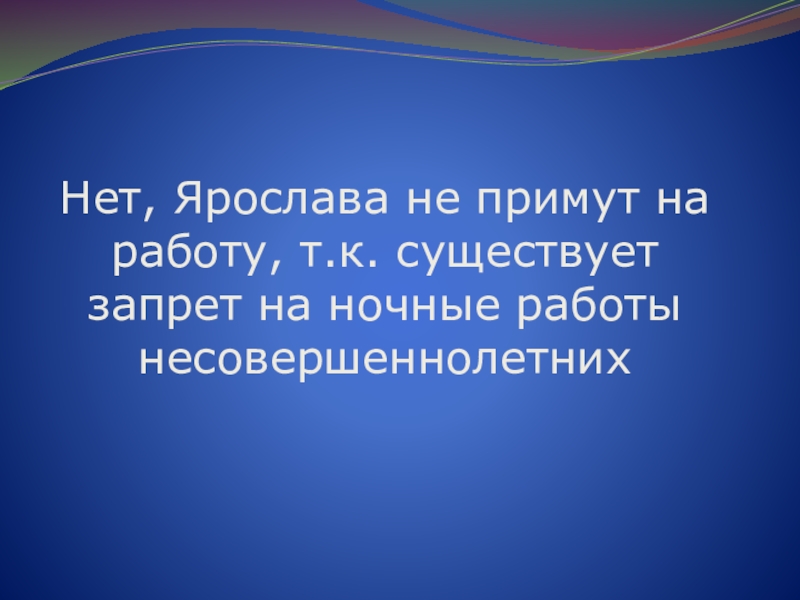 Слайд 64Нет, Ярослава не примут на работу, т.к. существует запрет на ночные