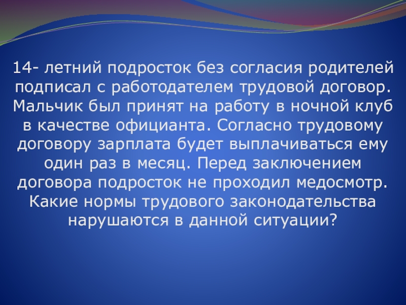 Слайд 6714- летний подросток без согласия родителей подписал с работодателем трудовой договор.