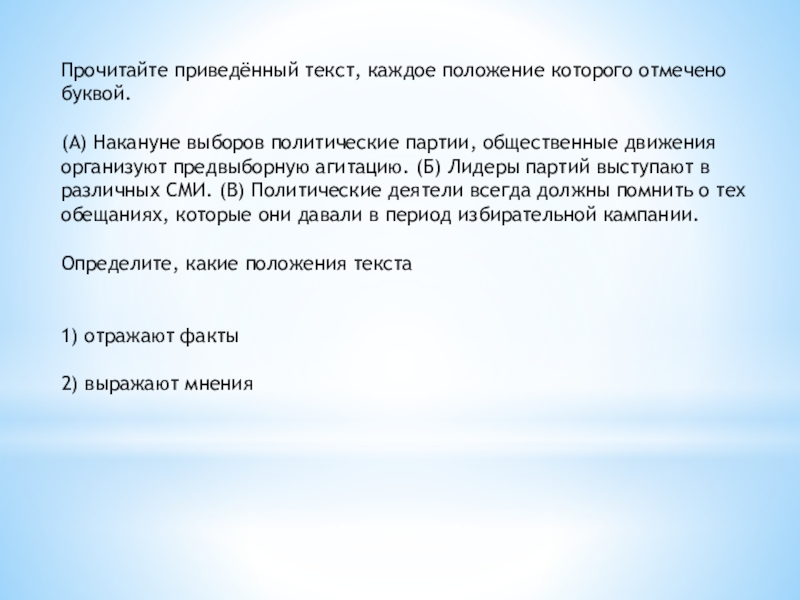 партии, общественные движения организуют предвыборную агитацию. (Б) Лидеры партий выступают в различных СМИ. (В) Политические деятели всегда должны помнить о тех обещаниях, которые они давали в период избирательной кампании.