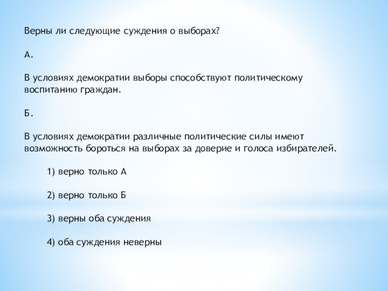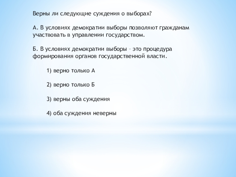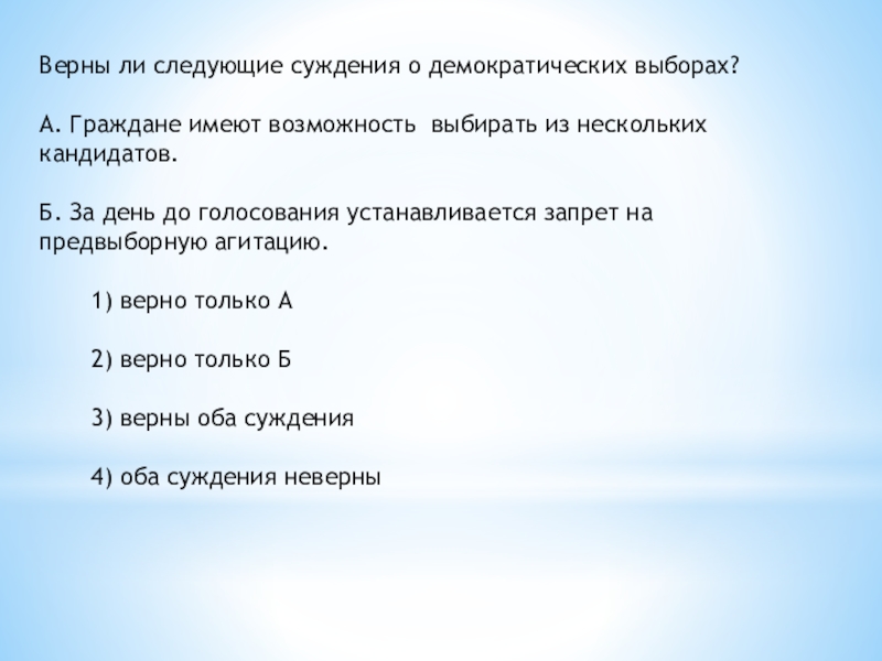 Слайд 29Верны ли следующие суждения о демократических выборах?