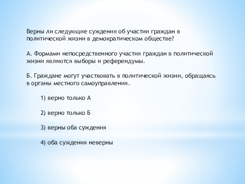 Слайд 27Верны ли следующие суждения об участии граждан в политической жизни в