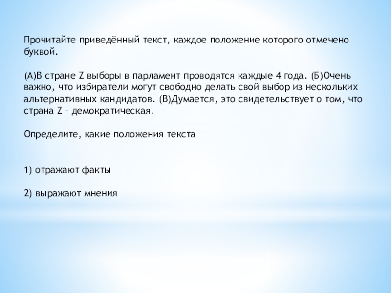 в парламент проводятся каждые 4 года. (Б)Очень важно, что избиратели могут свободно делать свой выбор из нескольких альтернативных кандидатов. (В)Думается, это свидетельствует о том, что страна Z – демократическая.