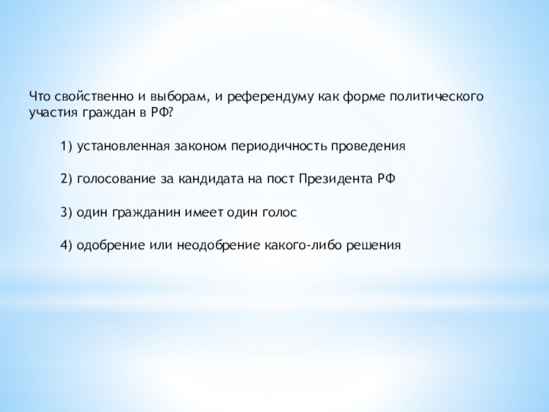 Слайд 34Что свойственно и выборам, и референдуму как форме политического участия граждан