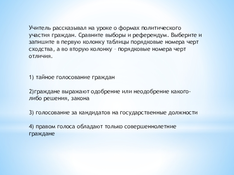 Слайд 37Учитель рассказывал на уроке о формах политического участия граждан. Сравните выборы