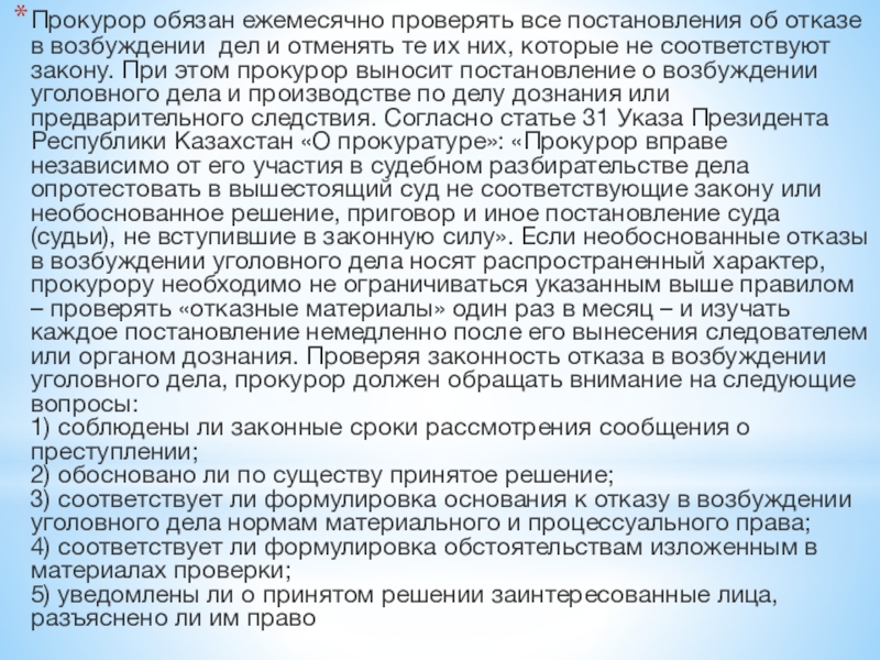 и отменять те их них, которые не соответствуют закону. При этом прокурор выносит постановление о возбуждении уголовного дела и производстве по делу дознания или предварительного следствия. Согласно статье 31 Указа Президента Республики Казахстан «О прокуратуре»: «Прокурор вправе независимо от его участия в судебном разбирательстве дела опротестовать в вышестоящий суд не соответствующие закону или необоснованное решение, приговор и иное постановление суда (судьи), не вступившие в законную силу». Если необоснованные отказы в возбуждении уголовного дела носят распространенный характер, прокурору необходимо не ограничиваться указанным выше правилом – проверять «отказные материалы» один раз в месяц – и изучать каждое постановление немедленно после его вынесения следователем или органом дознания. Проверяя законность отказа в возбуждении уголовного дела, прокурор должен обращать внимание на следующие вопросы:
