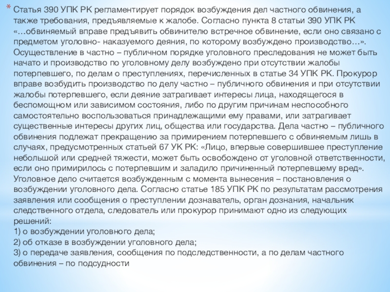 Слайд 8Статья 390 УПК РК регламентирует порядок возбуждения дел частного обвинения, а