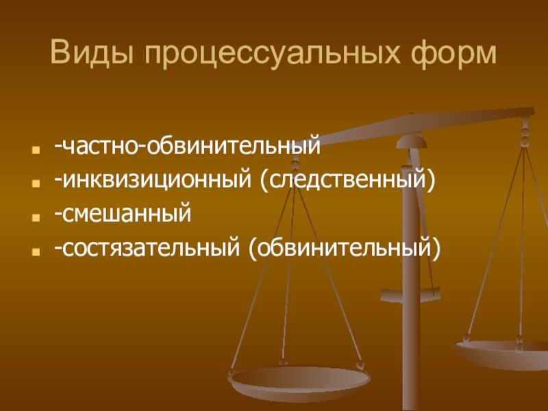Виды процессуальных форм-частно-обвинительный-инквизиционный (следственный)-смешанный-состязательный (обвинительный)