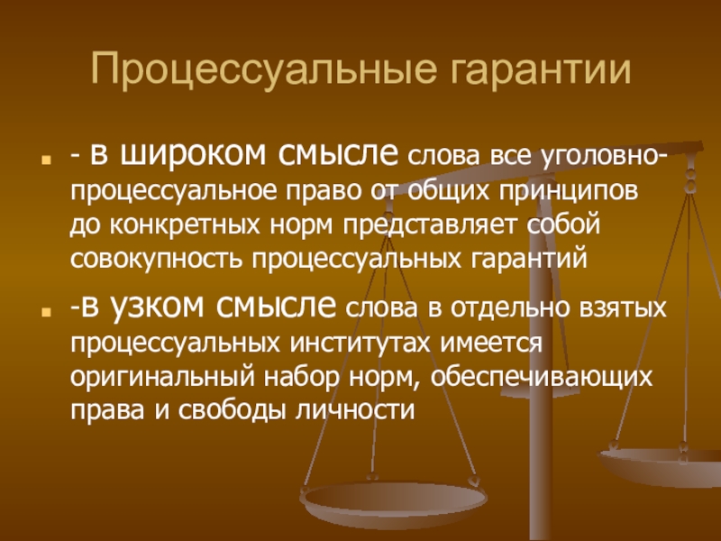 Процессуальные гарантии- в широком смысле слова все уголовно-процессуальное право от общих принципов до конкретных норм представляет собой