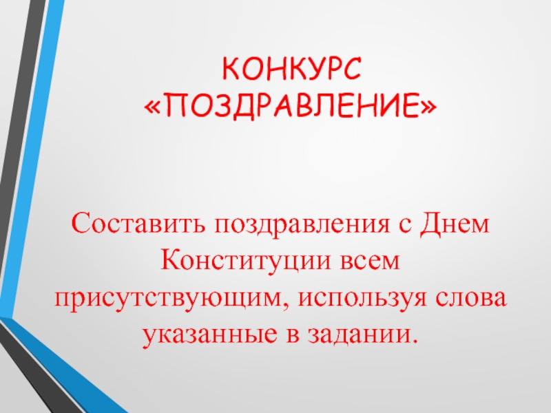 КОНКУРС  «ПОЗДРАВЛЕНИЕ»Составить поздравления с Днем Конституции всем присутствующим, используя слова указанные в задании.