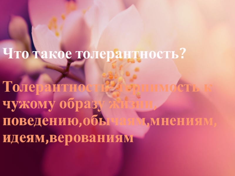 Что такое толерантность?Толерантность- терпимость к чужому образу жизни,поведению,обычаям,мнениям,идеям,верованиям