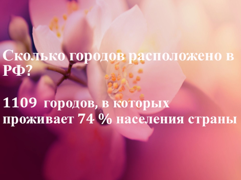 Сколько городов расположено в РФ?1109 городов, в которых проживает 74 % населения страны