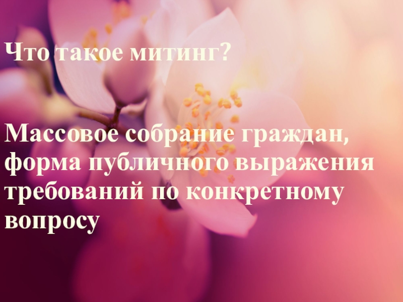 Что такое митинг?Массовое собрание граждан,форма публичного выражения требований по конкретному вопросу