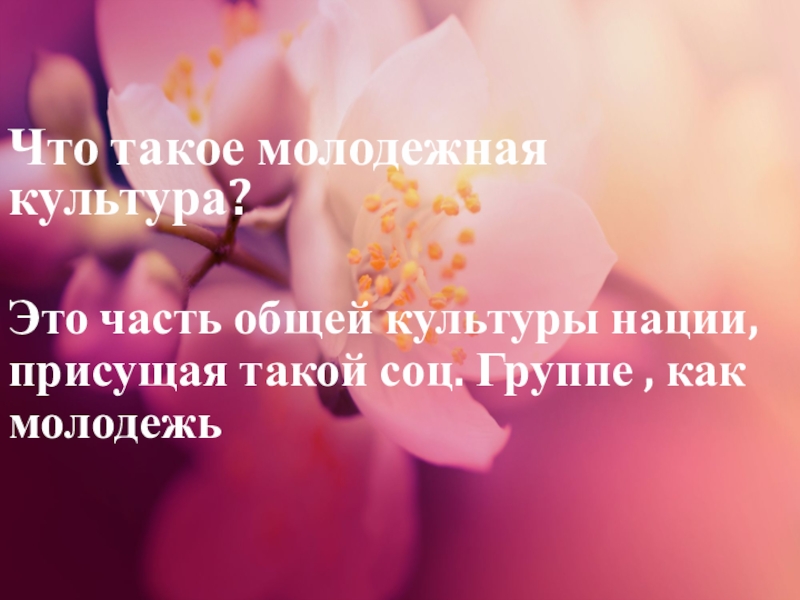 Что такое молодежная культура?Это часть общей культуры нации, присущая такой соц. Группе , как молодежь