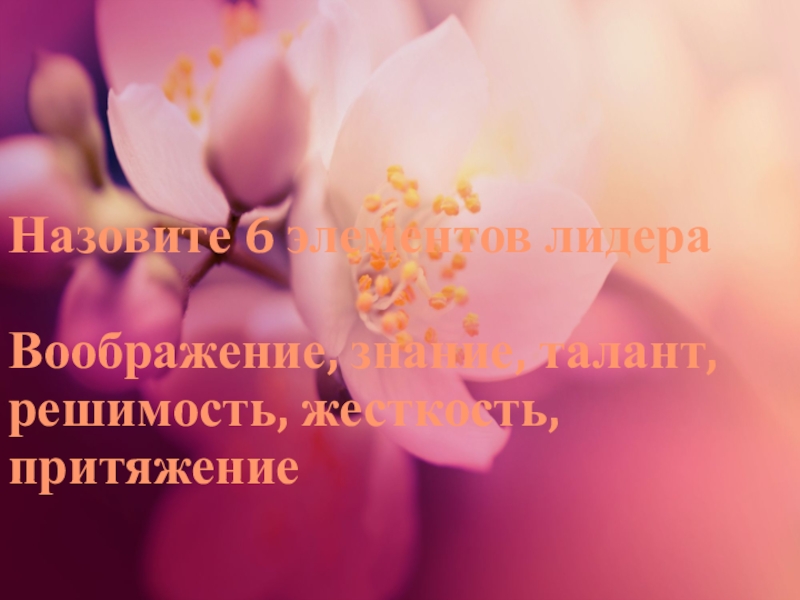 Назовите 6 элементов лидераВоображение, знание, талант, решимость, жесткость, притяжение
