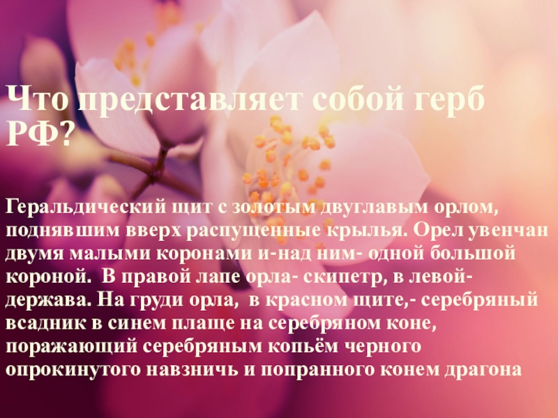 Что представляет собой герб РФ?Геральдический щит с золотым двуглавым орлом, поднявшим вверх распущенные крылья. Орел увенчан двумя