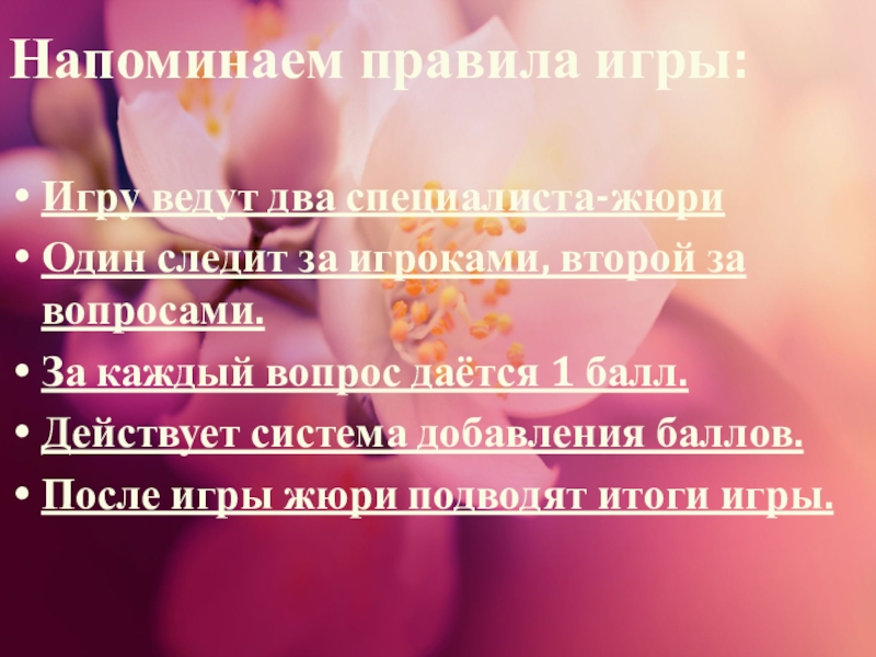 Напоминаем правила игры:Игру ведут два специалиста-жюриОдин следит за игроками, второй за вопросами.За каждый вопрос даётся 1 балл.Действует система добавления баллов.После игры жюри подводят итоги игры.
