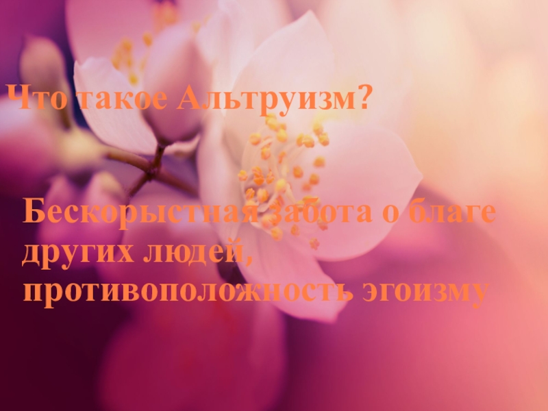 Что такое Альтруизм?Бескорыстная забота о благе других людей, противоположность эгоизму