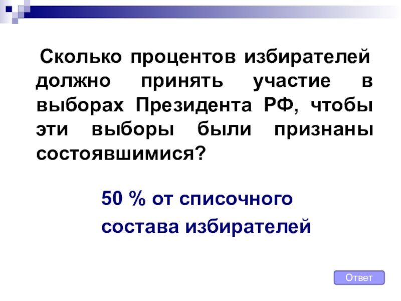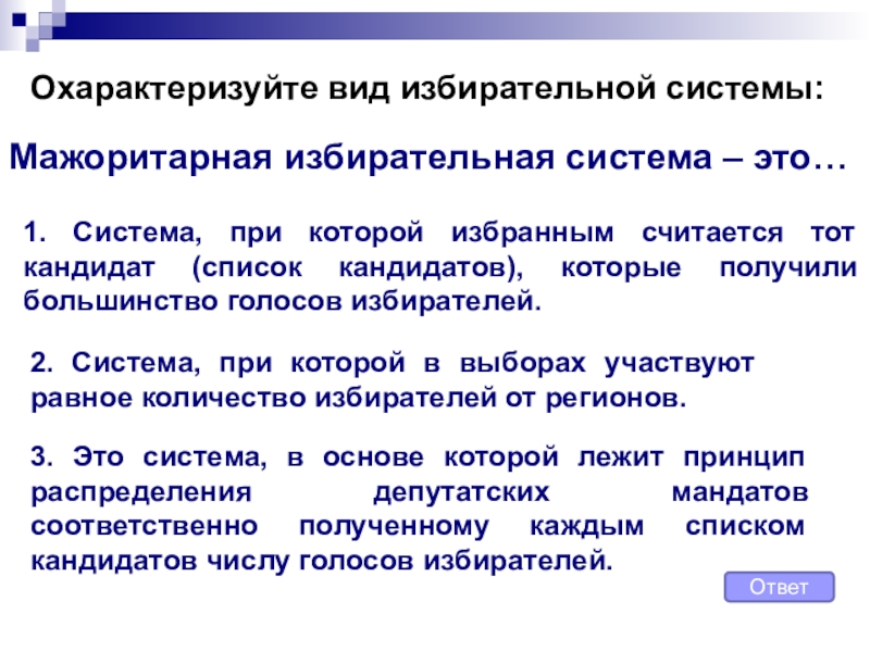 1. Система, при которой избранным считается тот кандидат (список кандидатов), которые получили большинство голосов избирателей.