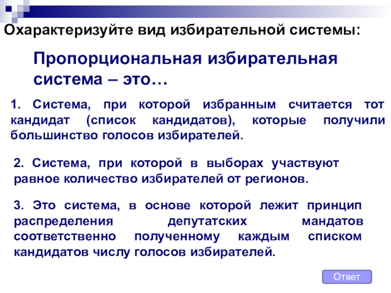 3. Это система, в основе которой лежит принцип распределения депутатских мандатов соответственно полученному каждым списком кандидатов числу голосов избирателей.