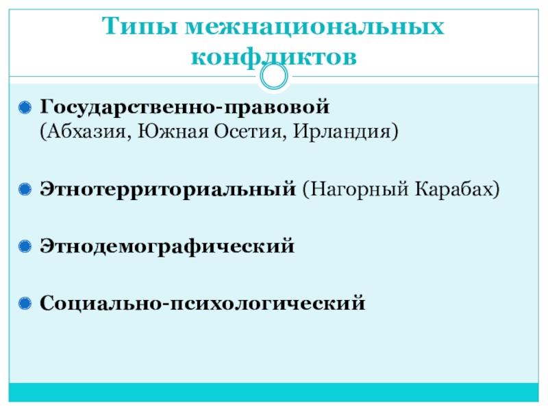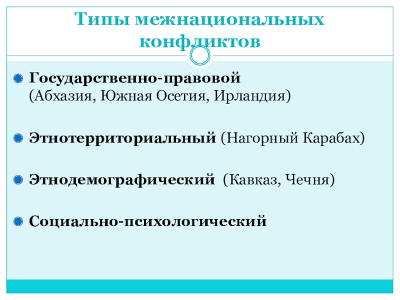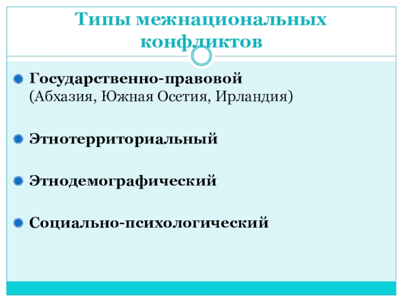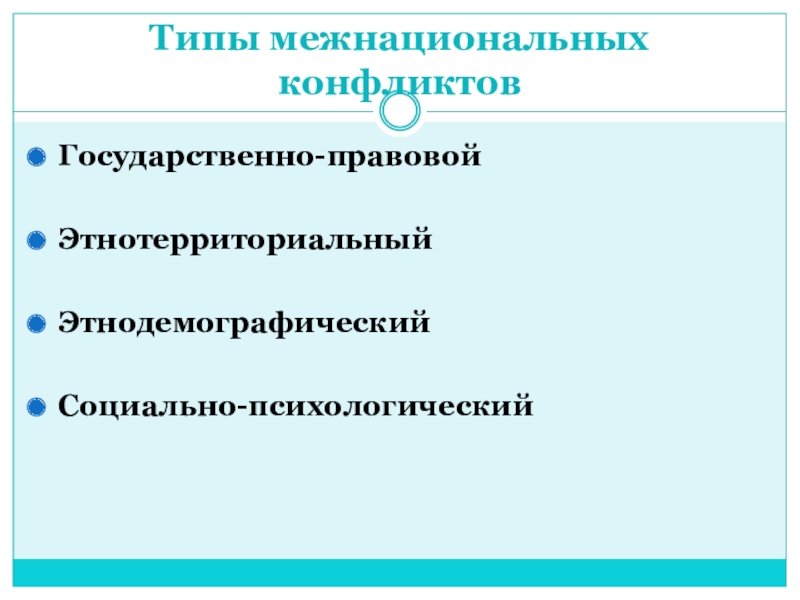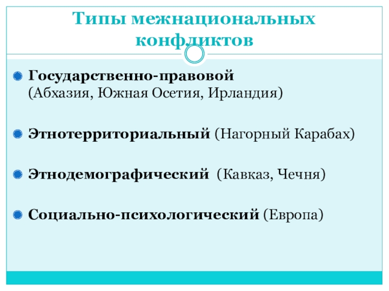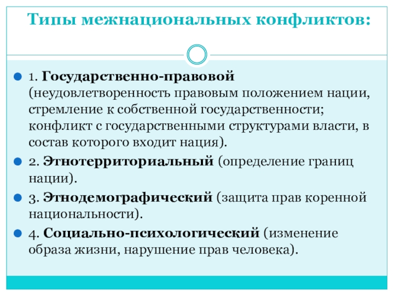 1. Государственно-правовой (неудовлетворенность правовым положением нации, стремление к собственной государственности; конфликт с государственными структурами власти, в состав которого входит нация).