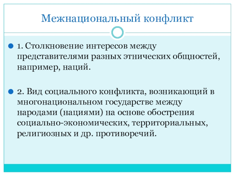 Вид социального конфликта, возникающий в многонациональном государстве между народами (нациями) на основе обострения социально-экономических, территориальных, религиозных и др. противоречий.