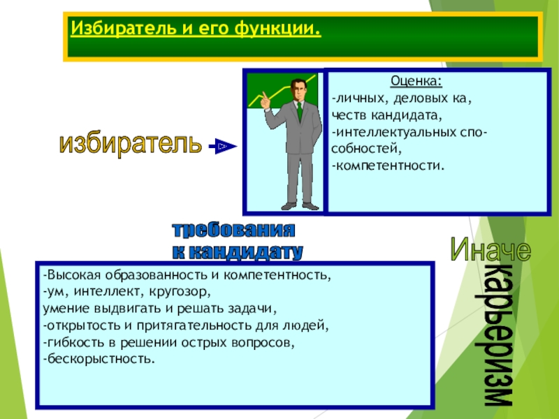 Избиратель и его функции.требования к кандидату-Высокая образованность и компетентность,-ум, интеллект, кругозор,умение выдвигать и решать задачи,-открытость и притягательность
