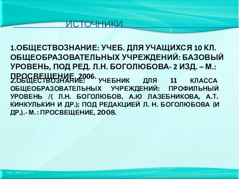 1.ОБЩЕСТВОЗНАНИЕ: УЧЕБ. ДЛЯ УЧАЩИХСЯ 10 КЛ. ОБЩЕОБРАЗОВАТЕЛЬНЫХ УЧРЕЖДЕНИЙ: БАЗОВЫЙ УРОВЕНЬ, ПОД РЕД. Л.Н. БОГОЛЮБОВА- 2 ИЗД. – М.: ПРОСВЕЩЕНИЕ. 2006.