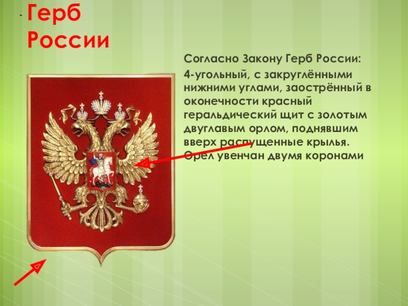 Герб РоссииСогласно Закону Герб России:4-угольный, с закруглёнными нижними углами, заострённый в оконечности красный геральдический щит с золотым