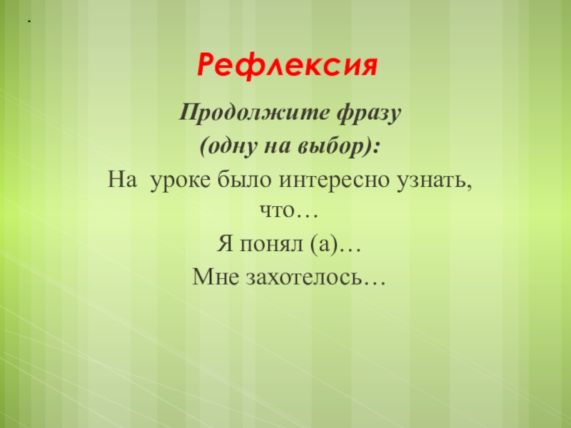 РефлексияПродолжите фразу (одну на выбор):На уроке было интересно узнать, что…Я понял (а)…Мне захотелось…