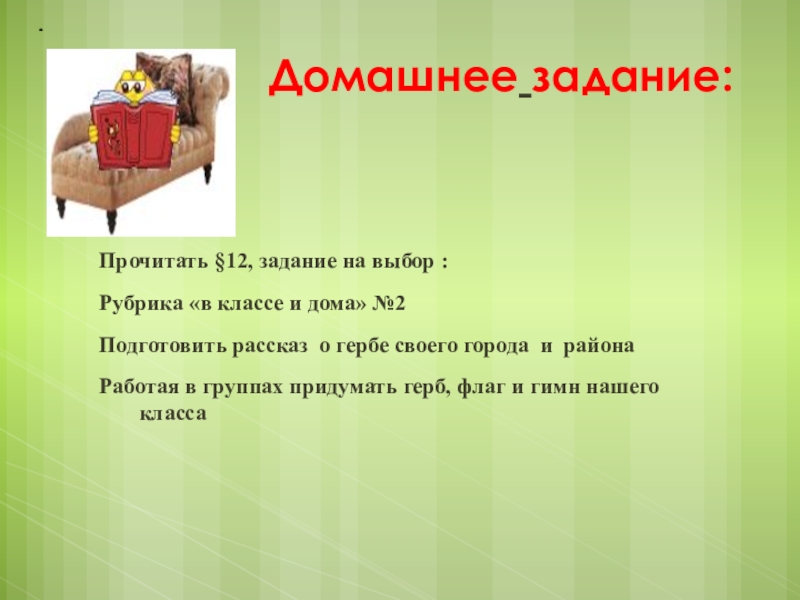 Домашнее задание:Прочитать §12, задание на выбор :Рубрика «в классе и дома» №2Подготовить рассказ о гербе своего города
