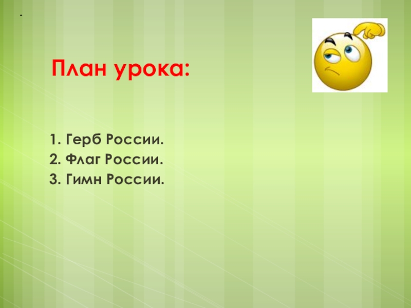 План урока:1. Герб России.2. Флаг России.3. Гимн России.