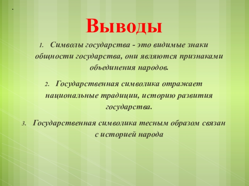 ВыводыСимволы государства - это видимые знаки общности государства, они являются признаками объединения народов.Государственная символика отражает национальные традиции,
