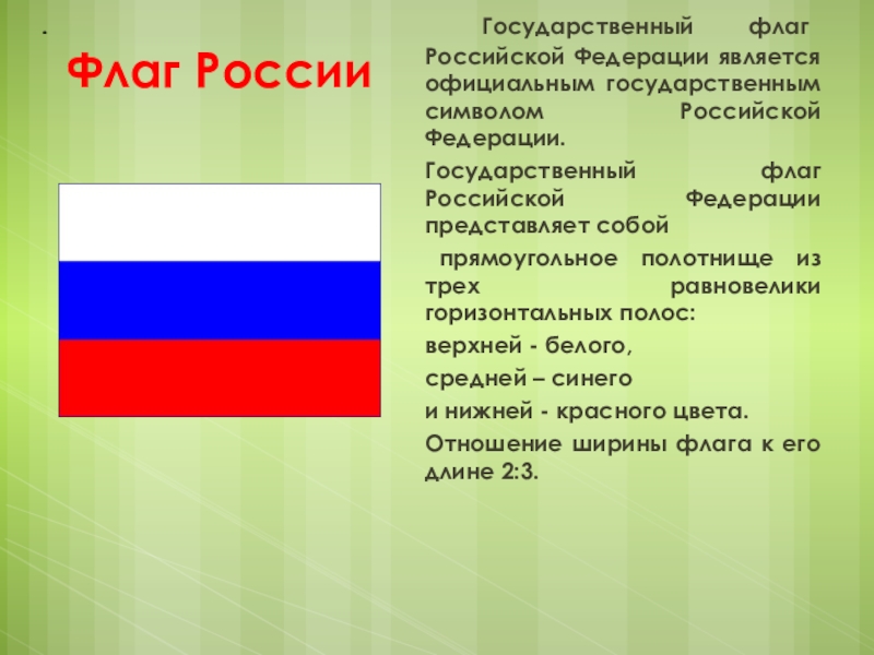 Флаг России Государственный флаг Российской Федерации является официальным государственным символом Российской Федерации.Государственный флаг Российской Федерации представляет собой
