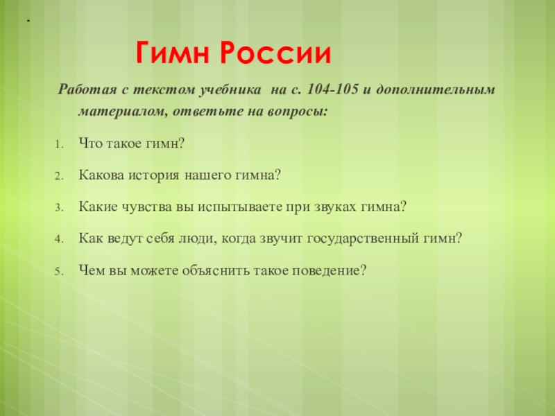 Гимн РоссииРаботая с текстом учебника на с. 104-105 и дополнительным материалом, ответьте на вопросы:Что такое гимн? Какова