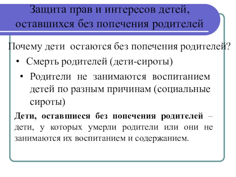 Дети, оставшиеся без попечения родителей – дети, у которых умерли родители или они не занимаются их воспитанием и содержанием.