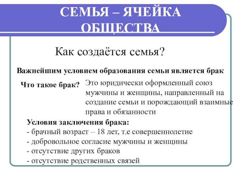 Это юридически оформленный союз мужчины и женщины, направленный на создание семьи и порождающий взаимные права и обязанности