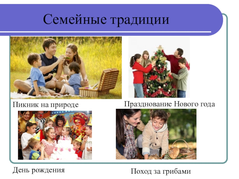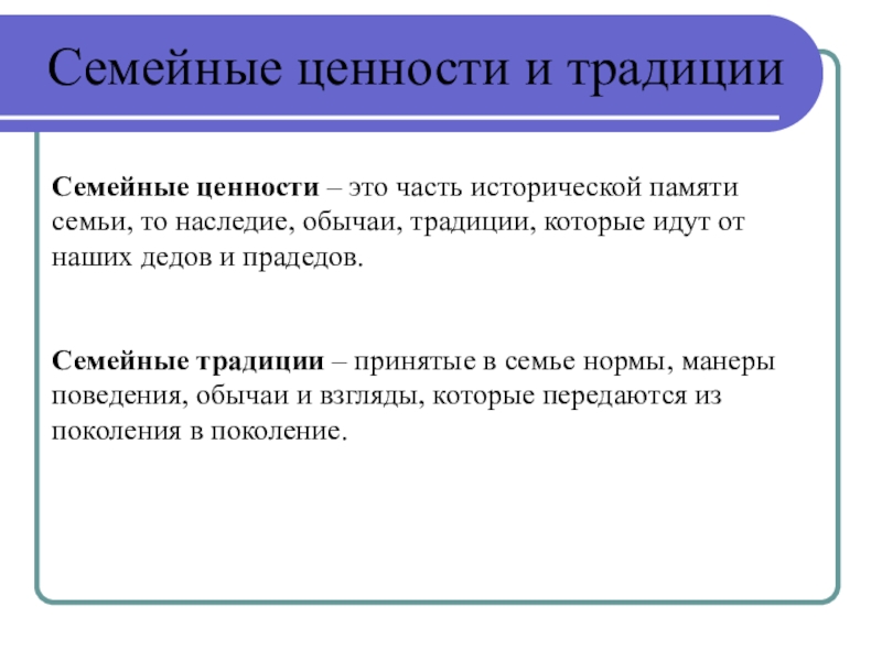 Семейные традиции – принятые в семье нормы, манеры поведения, обычаи и взгляды, которые передаются из поколения в поколение.